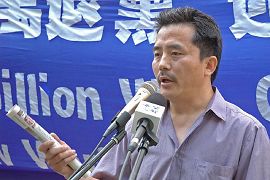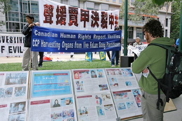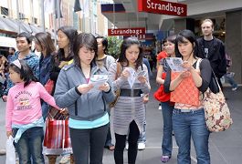 ![]() 市民接过传单,认真阅读 | ![]() 集会现场揭露中共暴政的图片展 |