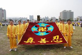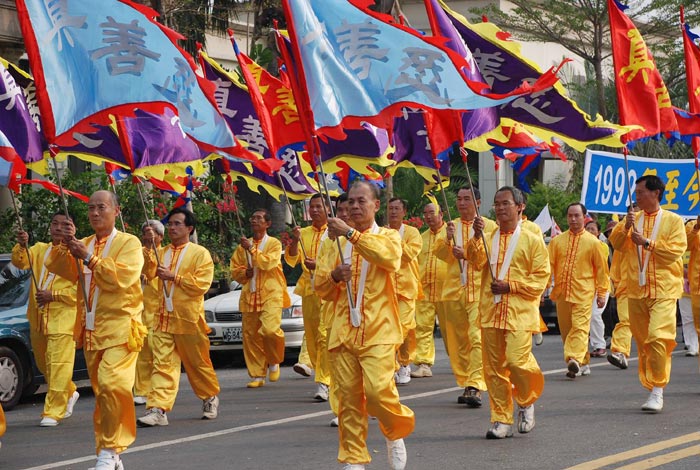 在唐鼓队宛如从天而降的咚咚鼓声中,游行队伍走进港都高雄繁华热闹的街道里。开道的“真善忍”大型横幅由三位穿着金黄色唐装的法轮功学员共同掮着,他们踩着平稳的步伐,表情肃穆祥和,紧接着一幅织着法轮图形的横幅,由几位法轮功学员昂首挺胸以四十五度的仰角擎着,金灿灿的迎向蓝天,使得午后车水马龙的街道,涌动着一股宁静祥和的暖流。