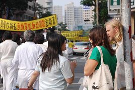 自一九九九年七月开始,中共在大陆残酷迫害法轮功,无数学员被关押劳教,或被迫流离失所、家庭破碎,甚而失去生命,最近又证实了中共活摘法轮功学员器官的惨无人道恶行。游行队伍里有真人模拟中共公安、警察向法轮功学员施以酷刑,及医生摘取人体器官的模拟演示,当这部车辆缓缓驶过时,整条街道顿时沉入哀凄的氛围。不了解真相的路人看到这幕景象,满怀疑惑的询问法轮功学员,听了学员说明以后,纷纷谴责中共这种惨绝人寰的恶行。