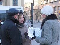 一位义工说,一些芬兰民众不明白英文横幅和标牌中的CCP是什么意思,经义工解释CCP是中国共产党的英文缩写,义工结合·九·评*進一步向他们讲了共产党的邪恶本质后,他们都点头说明白了。一位芬兰人还说,他去过德国,参观过纳粹集中营,现在中共的残暴比起当年的纳粹来有过之而无不及。