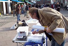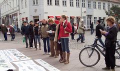 奥尔胡斯商业中心的小广场上,人来人往,人们的目光被声援活动所吸引,纷纷驻足观看。不少人拿了资料后当场就看起来。