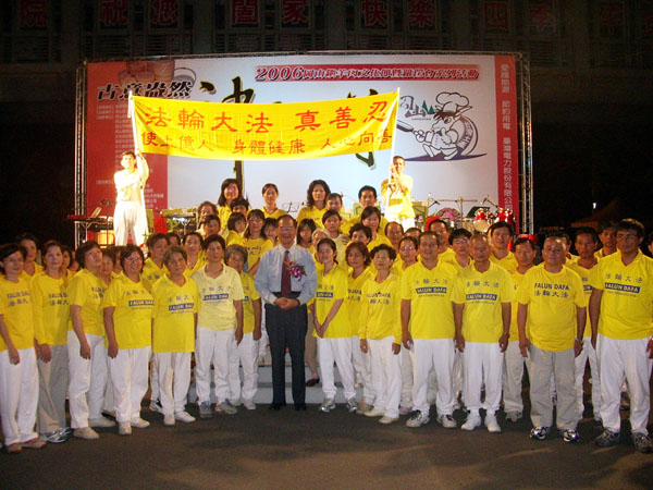 许多民众按下快门捕捉祥和优美的法轮功功法冈山镇吴镇长与法轮功学员一起合照法轮功学员共襄盛举,参与此次活动表演,现场演示五套功法。演示中学员们整齐、祥和的功法表演,吸引了现场的观看民众,有的民众当场就随着学员们的动作比划起来,有的民众交头接耳的讨论起法轮功来,有几个记者和自带摄影机、照相机的民众,从各个不同的角度捕捉着这功法表演的祥和景况。
