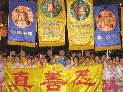 夜幕降临,七个小时的展示宣传圆满结束。大家依旧不卸表演服装,全体学员护拥着横幅,大幡旗高举在后,威风浩荡的走上了大马路,如游行一般拐上充满行人的长街,朝停车的地方缓步行進。一路上,惊愕、赞叹的目光跟从着、目送着,吸引了所有的路人,每一个法轮功学员都知道,他们心中感受到的震撼不是人的震撼,是佛法给予的震撼和对他们心灵的呼唤。