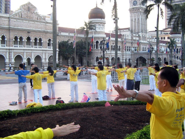 ![]() 出发前,法轮功学员在独立广场集体炼功 |