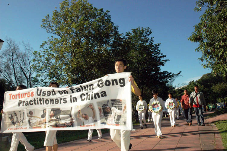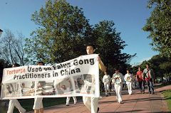 学员们手持揭露中共迫害和活摘器官暴行的横幅,以及被迫害致死学员的遗照参与游行。随后,学员们还以短剧演示中共残酷迫害和活体摘取法轮功学员器官的兽行,引起在场观众的关注。在场许多观众看了活摘器官的暴行后受到很深触动,掉下泪来。