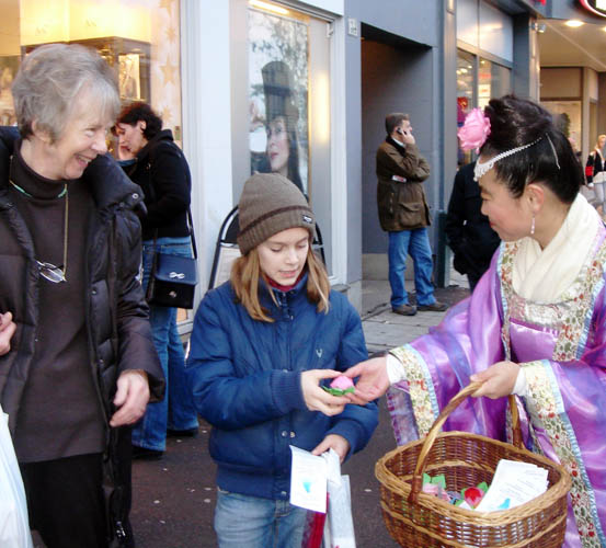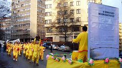 十二月十日是世界人权日,又是周末,奥斯陆街头行人众多。独特的游行队伍行进在奥斯陆最主要的商业街上,路人纷纷驻足观看。一辆警车在前方开道,由十几名身着黄色中国服装的队员组成的腰鼓队,在整齐的腰鼓声和退!党!歌声中,有节奏的缓缓行进。跟在腰鼓队后的是两位身着唐装的女士向儿童分发莲花和声援退!党!、揭露中共邪恶的真相资料。接到莲花的儿童和他们的母亲惊喜不已。队伍最后,是一幅四米高的巨大中文横幅“天灭中共”。一位穿着讲究的男士指着横幅问“这是什么意思?”当得到是“天灭中共”的答案后,他伸出大拇指说“我支持你们!”许多挪威人接到资料后,纷纷表示感谢,那种发自内心的兴奋溢于言表。