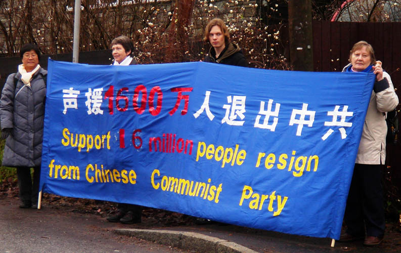游行前,关心中国人权的人士来到中国驻挪威大使馆前声援一千六百万人退出中共,并抗议中共破坏人权的恶行。