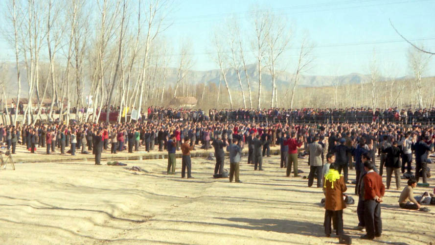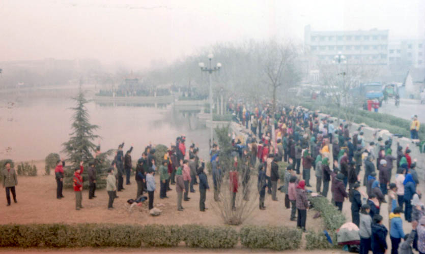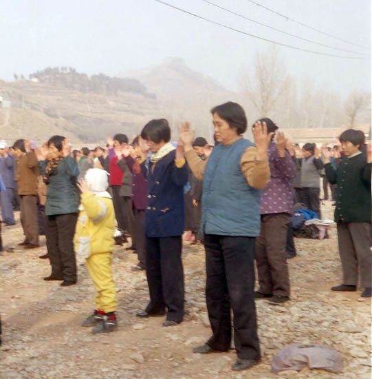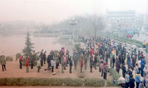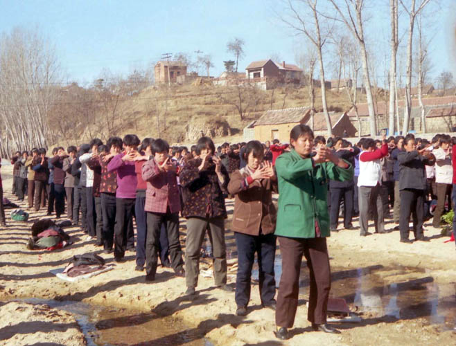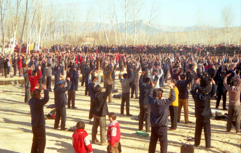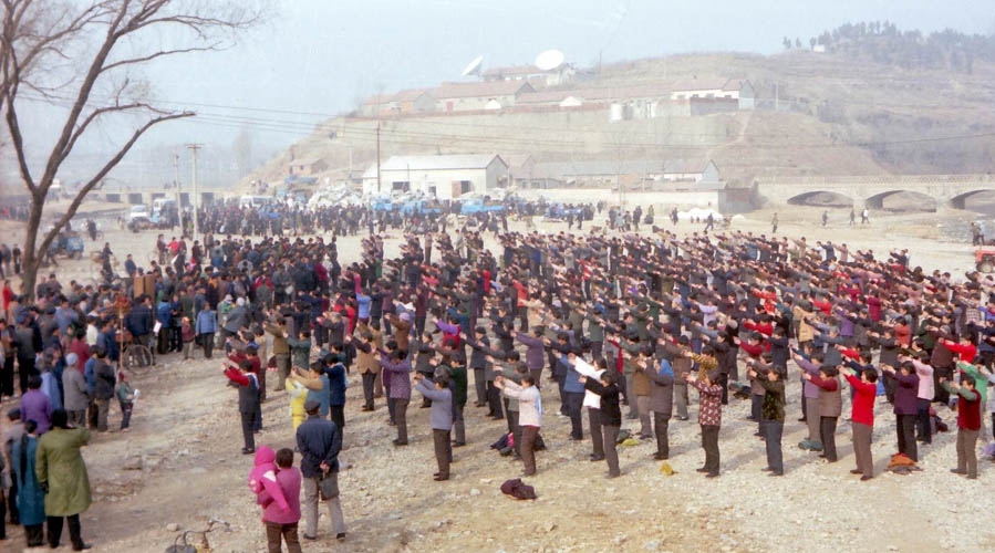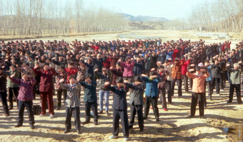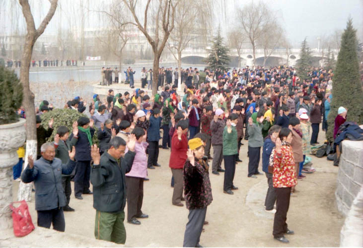 一九九八年春,山东省蒙阴县坦埠镇的法轮功学员在集市上炼功洪法的场面。一九九八年春,山东省蒙阴县岱崮镇法轮功学员在集市的一角炼功洪法的场面。一九九八年春,山东省蒙阴县野店镇的法轮功学员在集市旁边的河滩上集体炼功洪法并散发大法宣传材料。一九九八年元旦,数千名蒙阴法轮功学员在县城中心的汶溪公园集体炼功的场面。