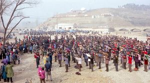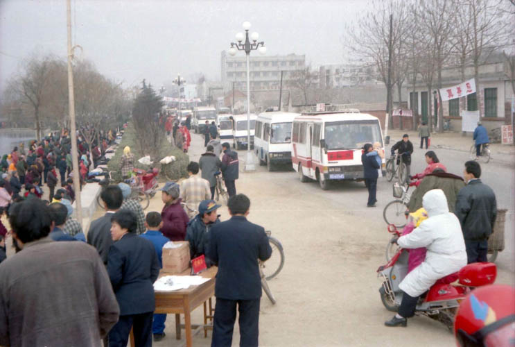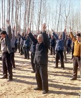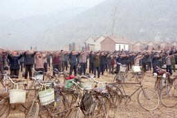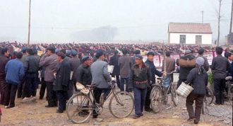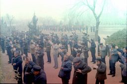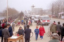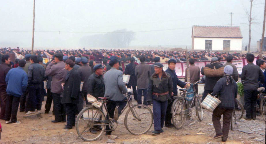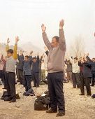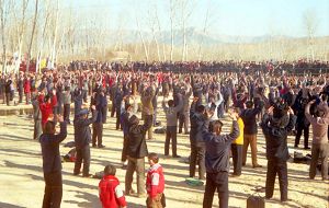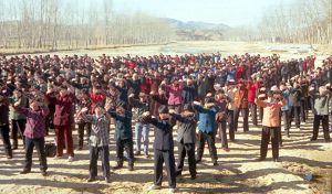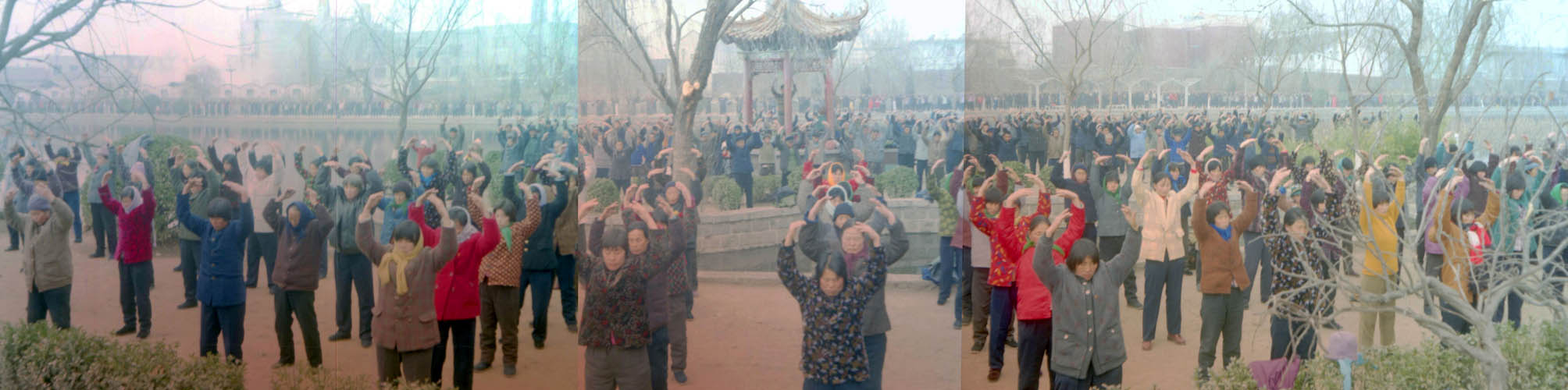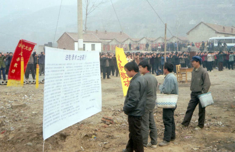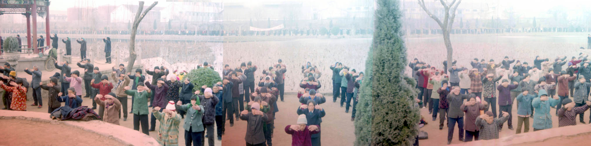 一九九八年春,山东省蒙阴县坦埠镇的法轮功学员在集市上炼功洪法的场面。一九九八年春,山东省蒙阴县岱崮镇法轮功学员在集市的一角炼功洪法的场面。一九九八年春,山东省蒙阴县野店镇的法轮功学员在集市旁边的河滩上集体炼功洪法并散发大法宣传材料。一九九八年元旦,数千名蒙阴法轮功学员在县城中心的汶溪公园集体炼功的场面。