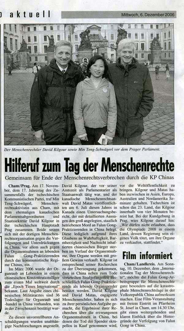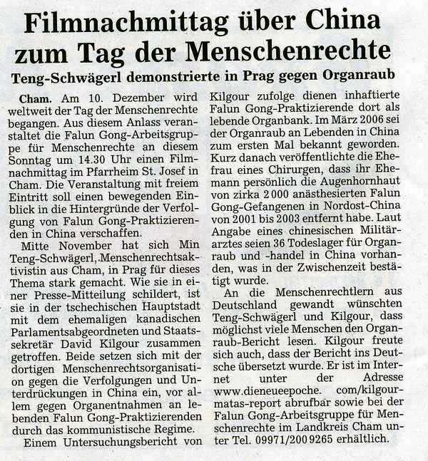 随着国际人权日的到来,德国卡姆地区(Cham)的国际人权协会(IGFM)以及法轮功人权组织强烈呼吁关注中国人权问题,关注法轮功修炼者等千千万万遭受中共邪*党-迫害的中国人的命运。呼吁得到了卡姆地区的报社、学校和教会的响应。卡姆时报(Chamland Aktuell),卡姆日报等纷纷刊登人权组织呼吁信,同时深度揭露中共恶党盗卖法轮功学员器官的惊天黑幕以及加拿大独立调查报告概要。