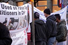 展位前揭露中共活摘法轮功学员身体器官暴行的展板上有被虐杀的法轮功学员的照片,他的脸庞因痛苦而扭曲。不少路人阅读了展板上的内容而获悉了法轮功真相,其中还有的父母带着孩子在阅读。有些路人径直的走到展位前,在抗议迫害的征签表格上签了名。