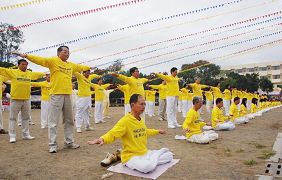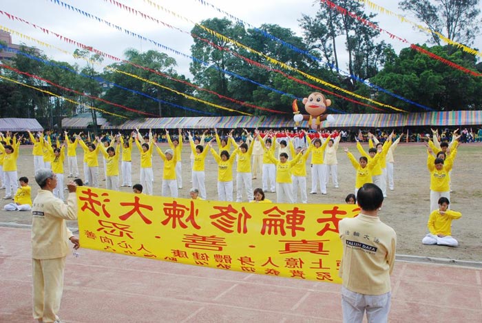 许多观众围绕在操场四周,一直专心的观赏着功法表演。结束时,该校辅导主任在扩音器里,除了感谢法轮功学员外,还为法轮功做了一次整体介绍:“法轮功在一九九二年由李洪志先生在中国长春传出,法轮大法是上乘的佛家修炼大法,以宇宙最高特性‘真、善、忍’为修炼原则,包含五套缓慢、优美的功法,修炼法轮大法只要反复静心通读《转法轮》,按照书中阐述的真善忍标准,要求心性的提高,并辅以炼功,短时间内就能达到意想不到的高层次效果,最后返本归真。”