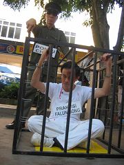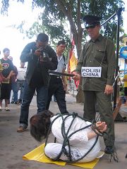 这次的世界人权日活动,受到当地媒体的注意,几家报社都派出记者采访。看到酷刑模拟演示,记者们纷纷提出法轮功学员为什么在中国遭受迫害的疑问。摄影记者拿起照相机,拍下中共恶党对法轮功学员所施的酷刑。