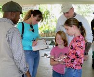 在公园凉亭的另一角是教功和教折莲花的桌子。学员们不断的演示法轮功功法,平和的炼功动作与亭子内的器官摘取模拟演示形成了鲜明的对照。有一家的人在展览前停留了很久。他们仔细听取了在中国的迫害后,在呼吁制止迫害的请愿书上签名。然后一家人一起学功,折纸莲花。