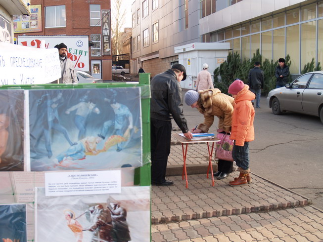 法轮功的罪行,并征集签名。很多人了解真相后,签名表示支持学员,谴责中共暴行。