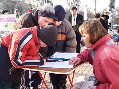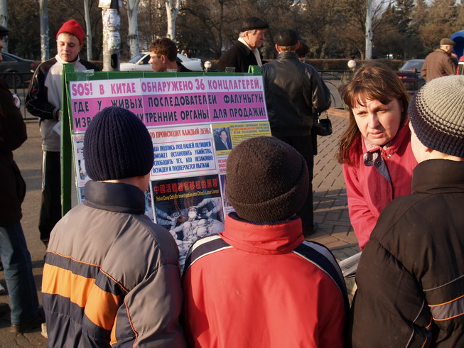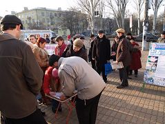【明慧网二零零六年十二月十九日】二零零六年十二月十七日,乌克兰克拉玛托尔斯克(Kramatorsk)的法轮功学员在城市中心举行活动,利用两位中国籍法轮功学员在乌克兰申请难民的机会向世人揭露中共