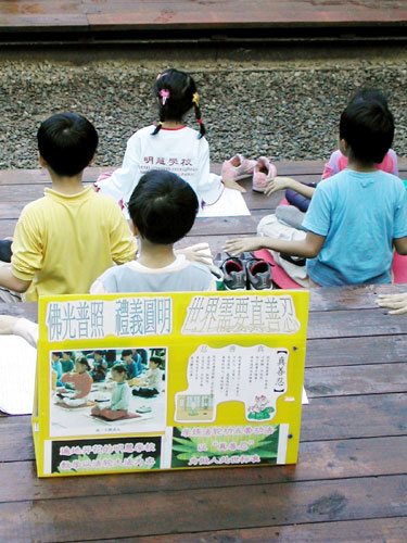 看着他们一张张晶莹剔透的小孩粉脸,却稳健自然的端坐如山,那种自在如意的气质真是令人惊异与心折,让我们不知不觉的想要多捕捉这难得的镜头,活蹦乱跳不懂事的小孩在这里展现的是纯净与庄严,仿佛从生命的本质将孩子提升上来了一般,回头看看展板上一张写着“高德大法引迷途”的照片,心想百闻不如一见,法轮功洪传世界八十余国,在中共打压、造谣的情况下还有这么多人坚定的学炼,这可不是没有道理的。