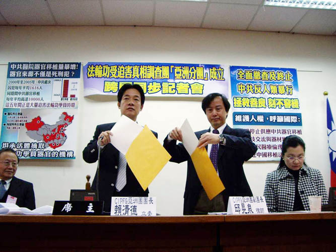 (明慧记者方慧台湾报导)甫于二零零六年十二月十日国际人权日成立的“法轮功受迫害真相调查团亚洲分团(CIPFG ASIA)”,十九日上午在台湾立法院召开记者招待会,与此同日,韩国、日本、香港、马来西亚及澳门等六个地区亦同步举行,誓言彻查及终止中共活摘器官的反人类暴行,并致信给中国国务院总理温家宝及中央政法委犯罪头目罗干,责令中共开放所有关押法轮功学员的处所,接受全面、公正、不受限制的彻查,以停止这场持续七年多的迫害。