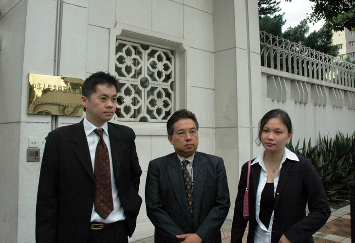 ![]() 递交信函后在中使馆外合影,左起:副团长云大舜律师、记者会主持人吴文强、亚洲分团成员陈美珊律师 |