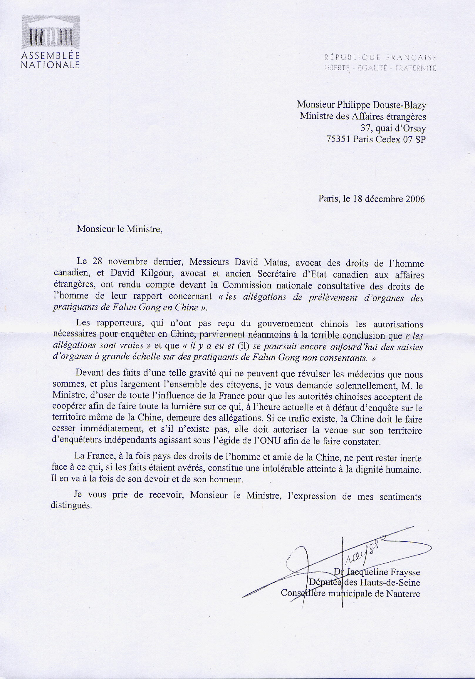 面对这样只能使象您和我这样的医生、乃至全体公民极度震惊的严重的事态,我郑重的请求您,部长先生,请运用法国的一切影响力,使中共政权接受合作,使目前因无法去中国调查而停留在指控阶段的那些事情真相大白于天下。如果这种(器官)买卖存在,中国应该立即制止;如果不存在,中国就应该同意联合国保护下的独立调查员在其境内进行核实与观察。