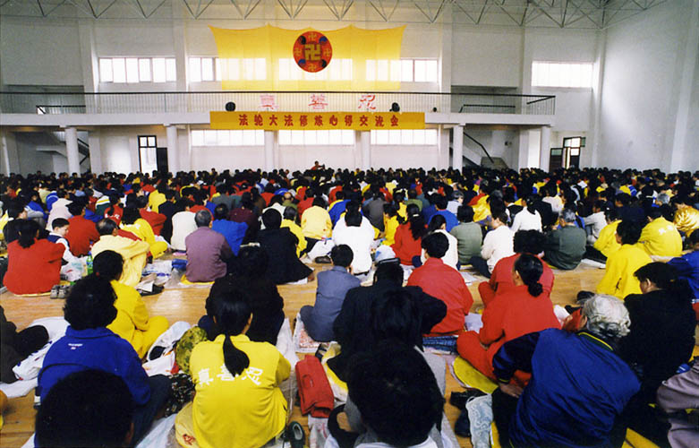 图片:九九年七二零前兰州大法弟子集体炼功学法的场面