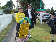 学员们到达Waipu小镇后,三三俩俩的前往圣诞游行的起始点集中。有两位学员手里拿着真、善、忍的“善”和“忍”字往前走。突然,他们被一个吹风笛的洋人拦住问好,接着他指着两位学员手里拿着的“善”和“忍”字,问:你们是从哪里来?手里拿的是什么?