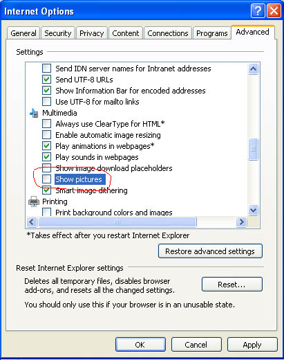 1. IE浏览器的设置:选“工具”(Tools)-->连网设置(Internet Options)-->高级选项(Advanced)-->多媒体设置(Multimedia)-->把“显示图片”前面的勾点一下,取消该选项(勾消失),再点“是”(Ok),退出设置。