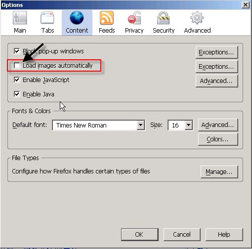 2. Firefox浏览器的设置:选“工具”(Tools)-->连网设置(Options)-->内容(Content)-->把“自动下载图片”前面的勾点一下,取消该选项(勾消失),再点“是”(Ok),退出设置。