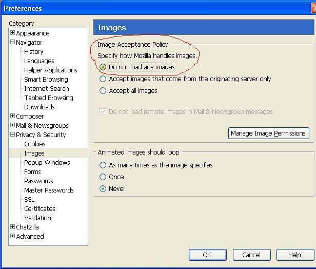 3. Mozilla浏览器的设置:选“喜好”(Preferences)-->隐私和安全(Privacy & Security)-->图片(Images)-->接收图片的规则(Image Acceptance Policy)-->在“不下载任何图片”前面的小圈点一下,选择该项,再点“是”(Ok),退出设置。