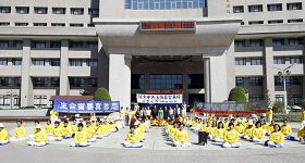 ![]() 六日上午台中县议会前厅聚集法轮功学员百余人, 以炼功方式,谴责中共活摘法轮功学员器官 |