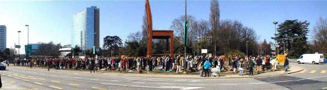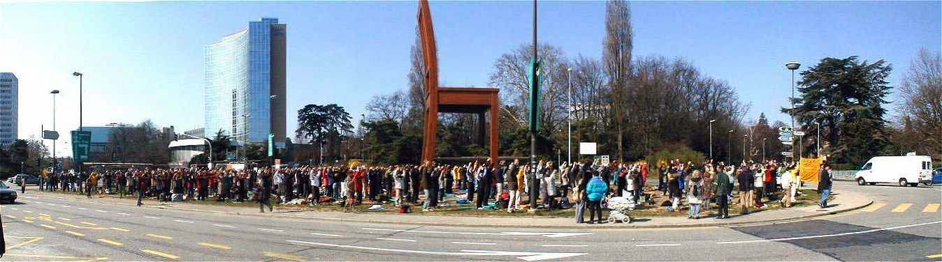 ![]() 2000年3月来自世界各地的法轮功学员在日内瓦联合国大门前集体炼功 |