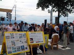 下车后,首先映入他们眼帘的就是法轮功学员的信息摊位——一张小桌子上放着各种语言的法轮功真相材料,CD,还有印有法轮功学员炼功照片的精美书签。更让他们惊讶的可能是旁边一些金发碧眼的西人正在随着优美的中国传统音乐炼法轮功呢。或许这音乐对他们来说已不陌生了,因为直到六年前,在中国有一亿多人修炼法轮功,早晨在公园里常常可以听到这样的音乐。最让他们惊讶的可能是展板上那一幅幅触目惊心的酷刑展示和被种种酷刑折磨后的法轮功学员的照片。