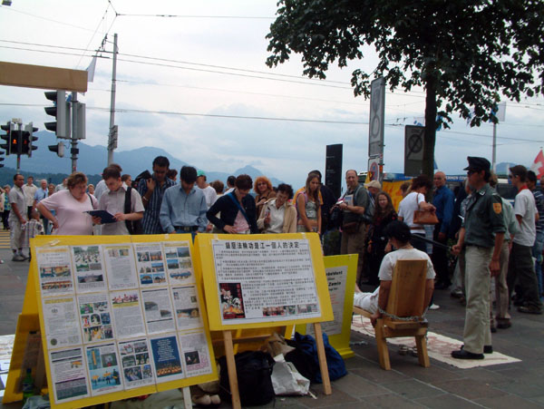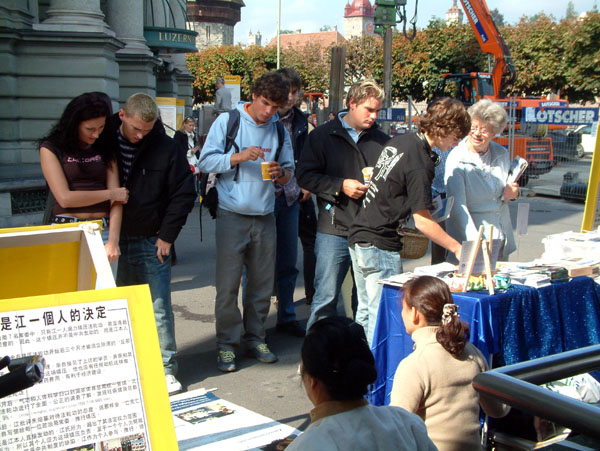 这样的场面已经发生过好多回了,我还记得是5、6年前吧,那时法轮功学员刚开始经常在卢塞恩的闹市区设立信息摊位,呼吁更多的人来关注正在中国发生的对无辜好人的迫害。常常会有很多路人停下来,看一看,听一听,拿上一份材料,或签上自己的名字表示支持。但是中国人除外,他们看见了常常会远远的绕开,或者慌慌张张的躲开。一开始让我非常不解,后来我常常听到那些法轮功学员试着解释国际教育发展组织已得出的结论,天安门自焚事件是中共一手导演的,法轮功学员只是按真善忍做个好职员、好学生、好母亲、好子女,在各方面都做个好人,不会抛家弃子……渐渐的我明白了,原来那些中国人是误解了这些法轮功学员了。