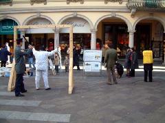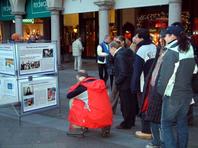 这时,旁边走来一位拿着很多传单的中年人,他用流利的意大利语告诉我们说,他们在演示正在中国发生的对法轮功学员的酷刑。随后他告诉我们,法轮功是一种中国传统的修炼方法,基于真善忍的原则,给人带来身心健康。法轮功学员只是希望能自由炼功并按着这个原则生活,却在中国受到了中共和江氏集团的残酷迫害。演示的只是酷刑的一种,和真实情况比起来只是冰山一角而已……我这时才发现,那位老妇和那个警察都是中国人,警察的制服上还写着“中国警察”的字样。