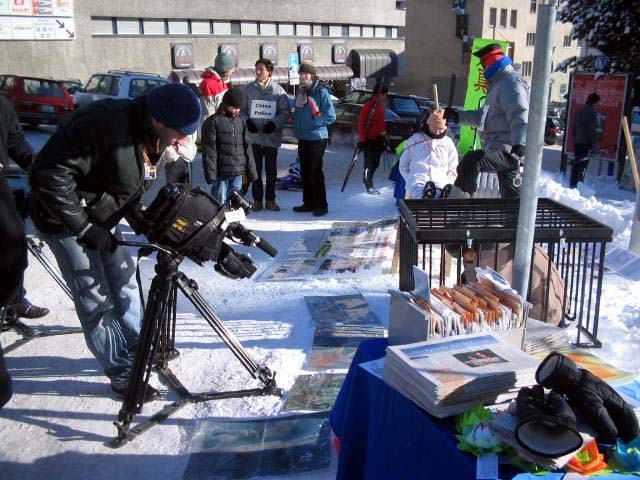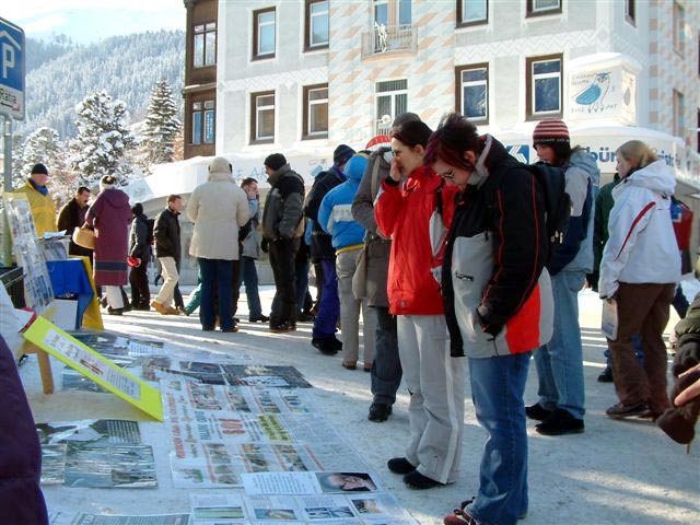 那是从2003年开始,在经济论坛开始的那一周我都会看到一群特别的人。他们既不是来开会的,也不是来滑雪的,更不是来抗议的。他们会静静的铲平雪堆,挂上横幅和一些图片,在一张小桌子上放上各种语言的材料。然后他们有的开始给路人发一些资料,并向路人解释着什么,有的就开始静静的随着音乐炼一种缓慢的功法,说句实在话我可真担心他们会不会被冻着,因为在零下20多度的寒冷中他们常常在积雪上铺上一张垫子就开始打坐,可是他们看上去似乎不容易受到寒冷的侵袭。他们为什么要在如此冰天雪地里炼功呢?在家炼不是要暖和多了吗?