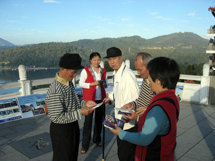 在日月潭的众多美景中,我们选择讲法轮功真相的地点是文武庙,在那里的正前方有一个大平台,来这儿的游客,都会站在平台上去欣赏湖中波光潋滟,享受着依山傍水的闲适生活。一清早,学员会将法轮功真相展板摆上直至九点,而有些地方甚至可以展至一整天。由于学员们几年来的努力,并和当地小摊贩保持良好的互动关系,这里成为我们讲真相的好地方。
