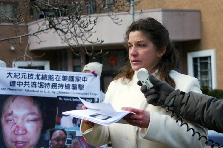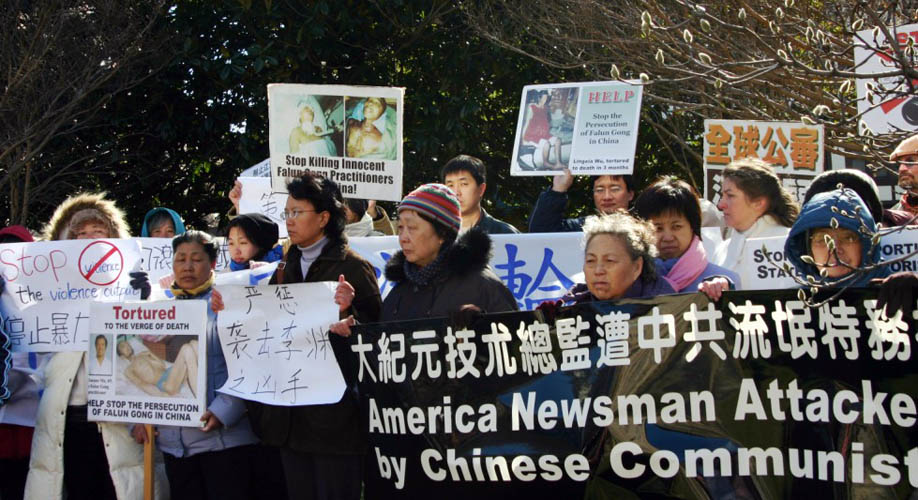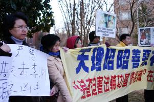 ![]() 华府法轮功学员和大.纪.元;工作人员在中使馆前抗议 |