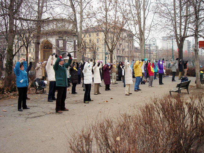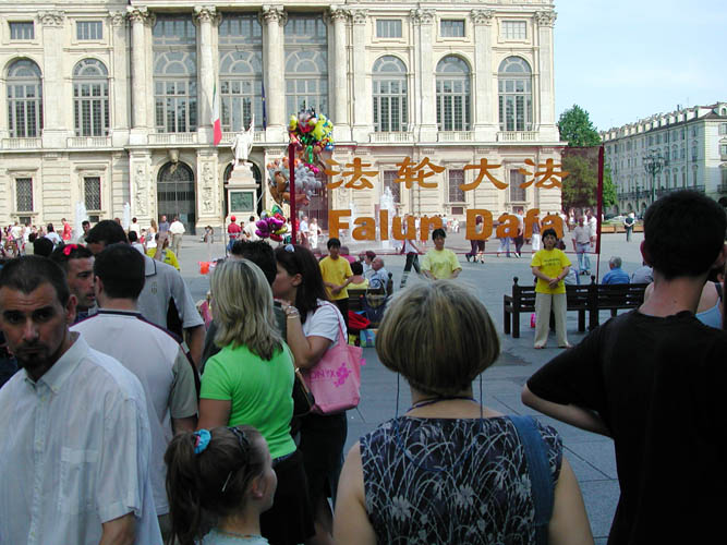 在这种情况下,2001年冬天,学员们开始在米兰的华人聚居区讲真相。当时的环境很差,也很邪恶。当地华人受中领馆控制非常厉害。有一次学员们在一家中餐馆旁边炼功,发小册子讲真相,由于受中国领事馆的唆使,餐馆不让把法轮功横幅挂在墙上,只好由两个学员用手举着,其他学员向行人展示功法,讲真相。当时中领馆的官员、侨领和华人媒体的主编们都来了。他们又是拍照,又是录像,领馆官员还唆使老板娘带着几个人提着水桶,假借擦玻璃为名,往炼功的地方泼脏水。由于学员事先向警察局申请,所以当时有便衣警察在保护学员,制止了他们,并对他们进行了罚款。几年来,随着学员们不懈的努力,当地很多华人从一开始的敌视,到通过观察发现法轮功学员并不是象中共媒体上写的那样,一直到主动要法轮功资料了解真相,中共的谎言一个个的破灭了。