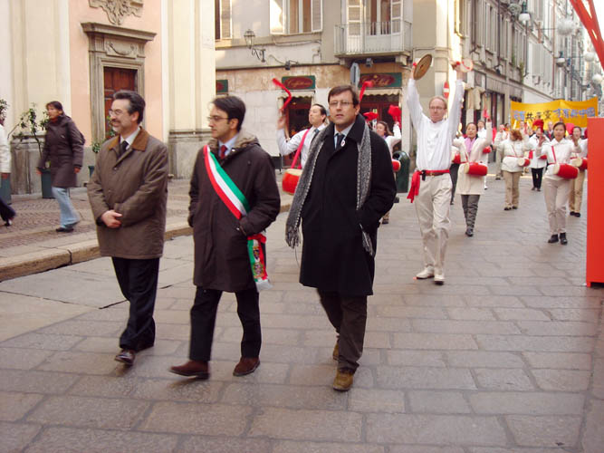 ![]() 冬奥会前夕,法轮功学员应邀参加声援770万中国勇士退出中共的游行,带着三色绶带的市长代表和皮埃蒙特大区议会议员走在队伍的最前面 |