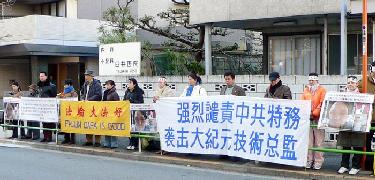 服务中心等团体在东京中国大使馆前举行抗议活动,强烈谴责中共流氓特务持枪袭击抢劫亚特兰大法轮功学员、大