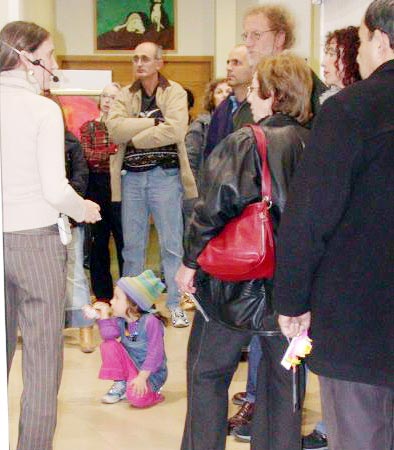 ![]() 向参观者讲解画作 | ![]() 法轮功学员展示功法 |