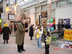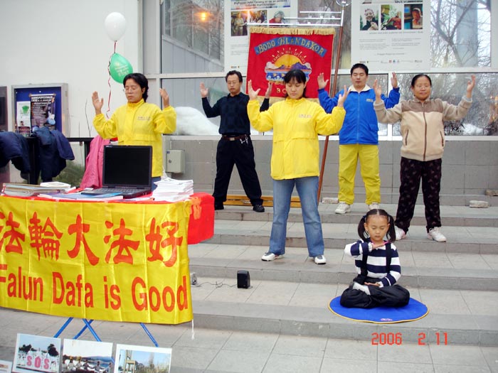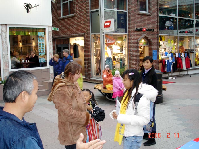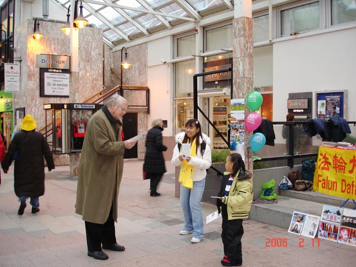 【明慧网2006年2月13日】Bodo是挪威北部一个美丽的沿海小城,人口近5万人。Bodo城市的名字取自英文“佛”,意为佛的城市。2006年2月,8名法轮功学员从泰国来到了Bodo。2月11日,星期六中午,包括三名小弟子在内的11名法轮功学员来到了Bodo市中心最繁华的闹市区洪法。
