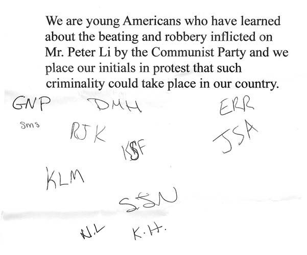 签名表上写着:我们是美国青年,了解了中共殴打、抢劫李渊的真相,我们抗议将这种犯罪行为输入到我们国家。我们在此签上我们名字的缩写,以示抗议。
