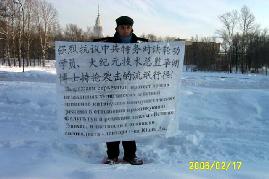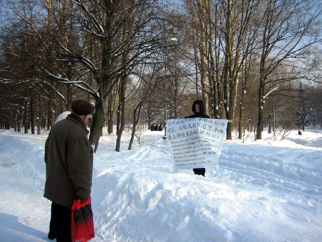 这次抗议活动虽然没有来得及申请集体抗议集会,按照俄罗斯许可个人抗议无需申请的法律,学员们排开班按顺序進行了三天的抗议绝食活动。这几天虽然气温接近零下20度,但学员们不畏严寒,在风雪中,向过往的行人讲述着法轮大法的美好和在中国发生的对修炼“真、善、忍”的好人的迫害,中共还把这种迫害延伸到海外。