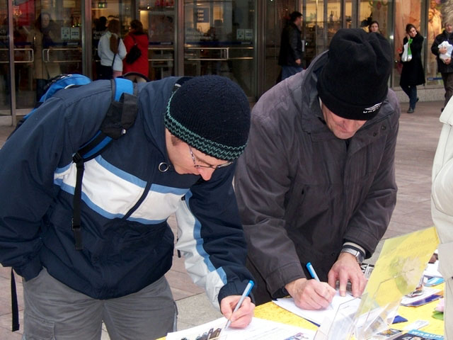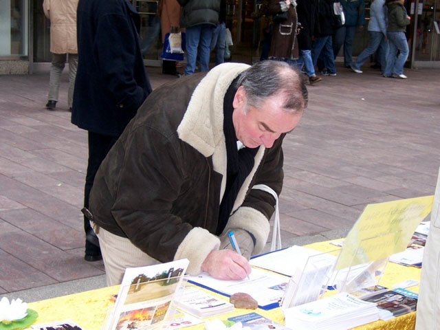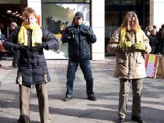 学员们在当天还举行了呼吁释放姜仁政的征签活动,姜仁政因为德国政府的错误判断而在2005年3月因申请庇护失败被德国遣返回中国,并因修炼法轮功而被中共非法判劳教三年。此外,法轮功学员还展示了为制止中共迫害无辜的法轮功修炼者的孩子的请愿书。