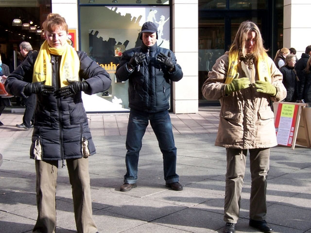 学员们不知疲倦的派发着传单。一个俄罗斯学员是第一次来这里,开始时她还有点担心,怕自己德语讲得不好,但很快的她便满脸善意的投入到派发传单中去。