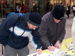 一位上了年纪的女士拿着真相传单表示想知道更多关于在中国的残酷迫害的状况。这位女士含着眼泪问,为抵制迫害她还能做些什么?学员拿出请愿书,她立刻签了名。