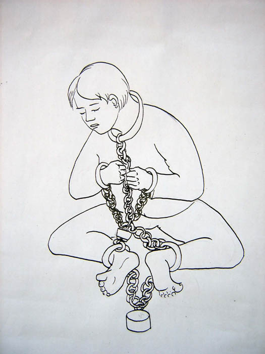 身后已没有空隙,然后再放一块上面有很多刺的木板。人经过这样一折腾,站在木板前只能踮着脚尖,难受程度可想而知。脚上也戴着手铐,勒上一宿,脚和腿便肿得很厉害,只有脚踝骨处很细,踝骨看的很清楚,因是被手铐勒的。