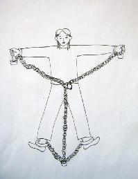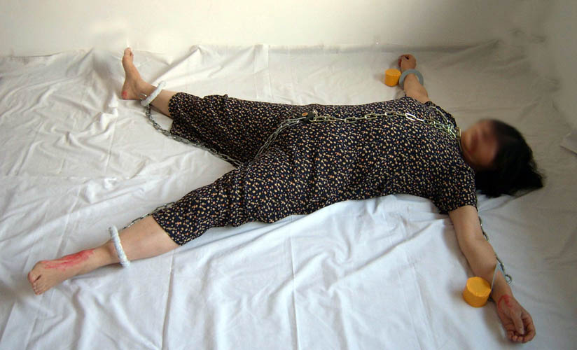 把大法弟子绑在犯人大铺上,身体成大字形,手戴手铐,脚戴脚镣,用铁链连结起来,用一把大锁锁在腹上。两手与两脚的铁链分别固定在桩上。