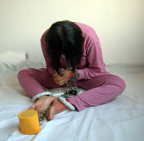 手和脚用手铐铐上,小臂和小腿全部用黄胶带缠在床的三角铁架子上,以此来达到转化大法弟子的目的。